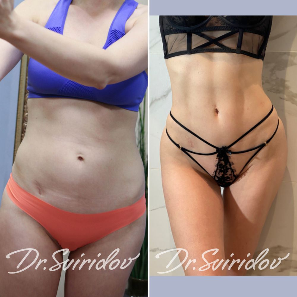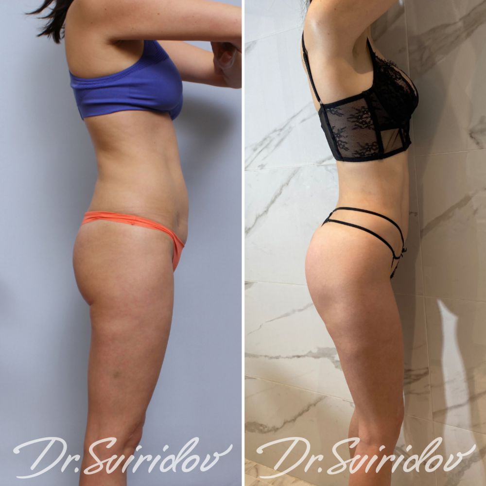 Пациентке выполнена: липоскульптура живота, спины и липофилинг ягодиц верхней части. Шрам справа и на пупке от аппендицита.