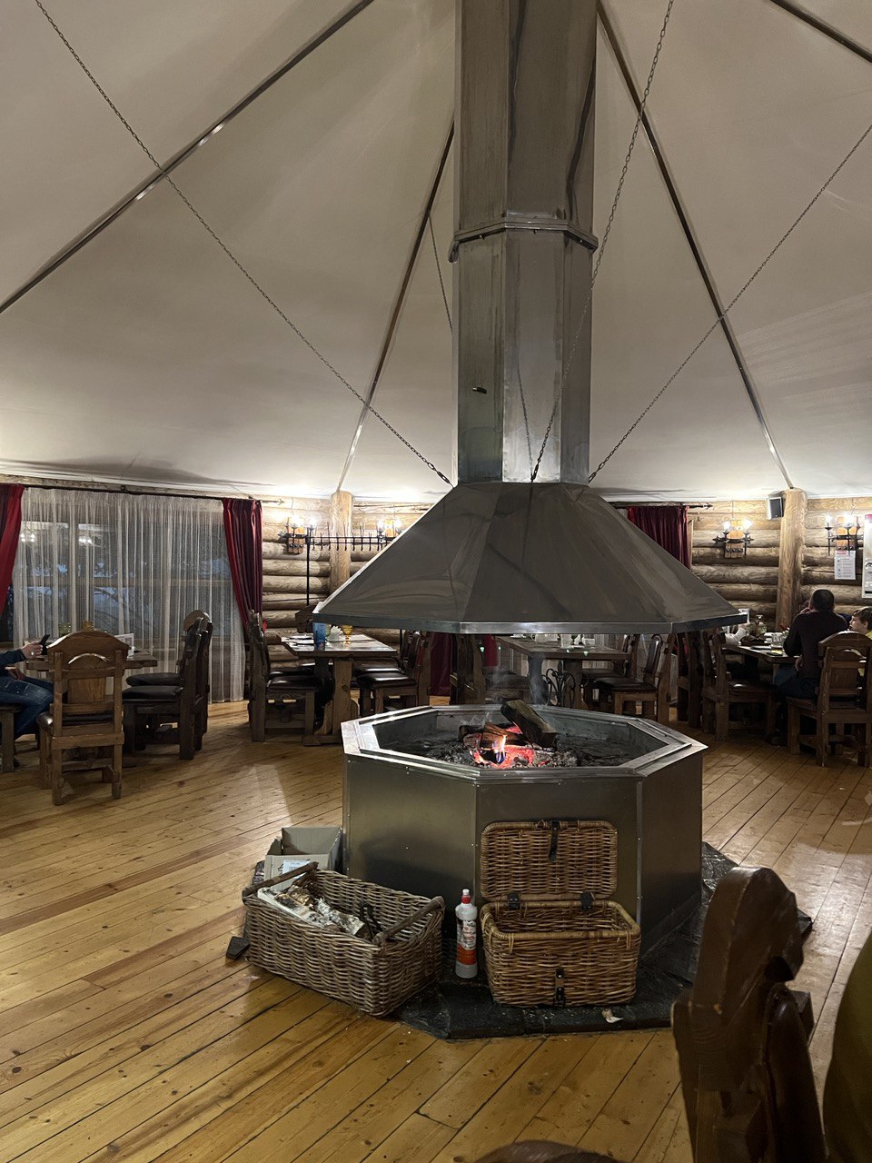 В загородном клубе с семьёй - рядом камин.