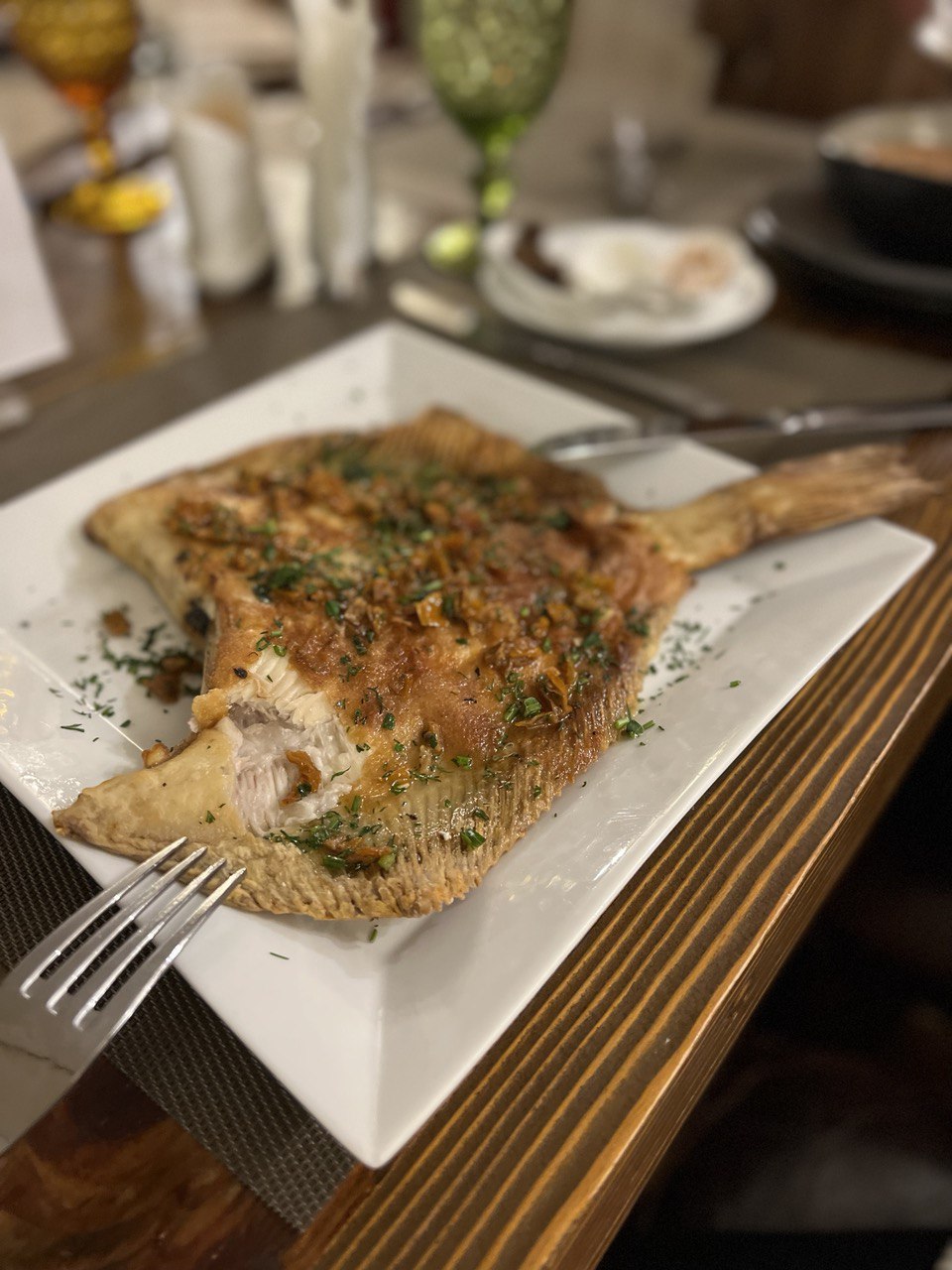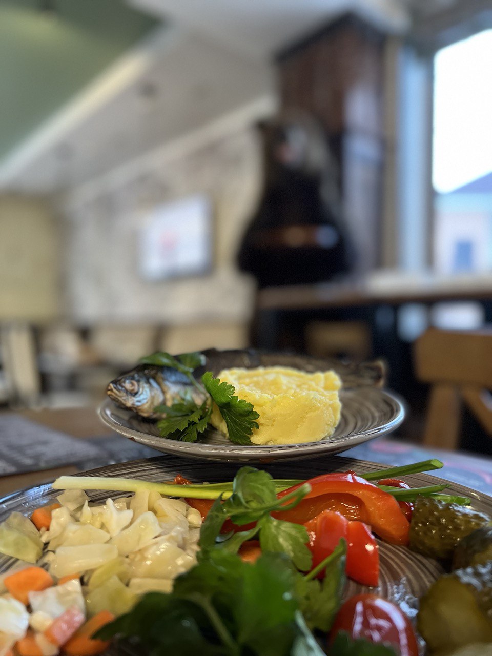 Или такой ужин в подмосковном отеле, когда катались на сноуборде в Сорочанах.