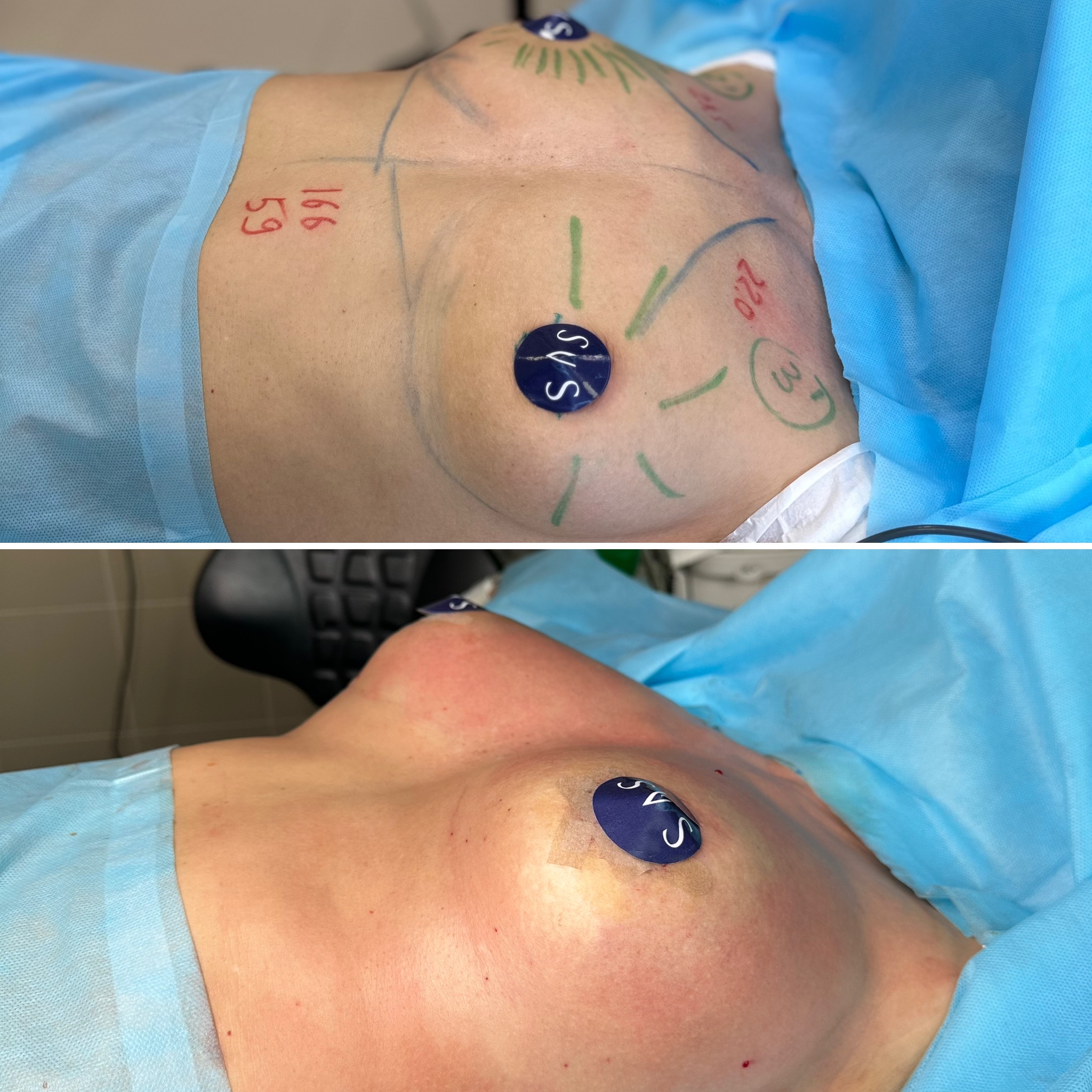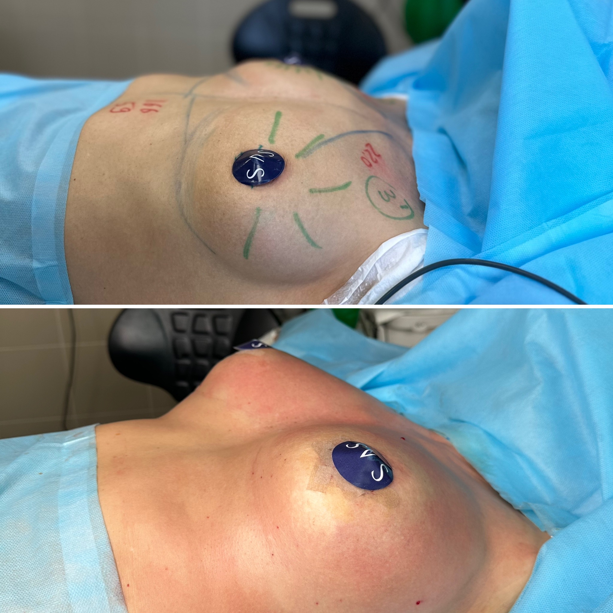 Соответственно, один сосок выше, другой ниже. В данной ситуации необходимо выполнить лазерное сокращение кожного чехла груди. Эта технология позволяет провести сложные случаи в маммопластике без подтяжки груди.