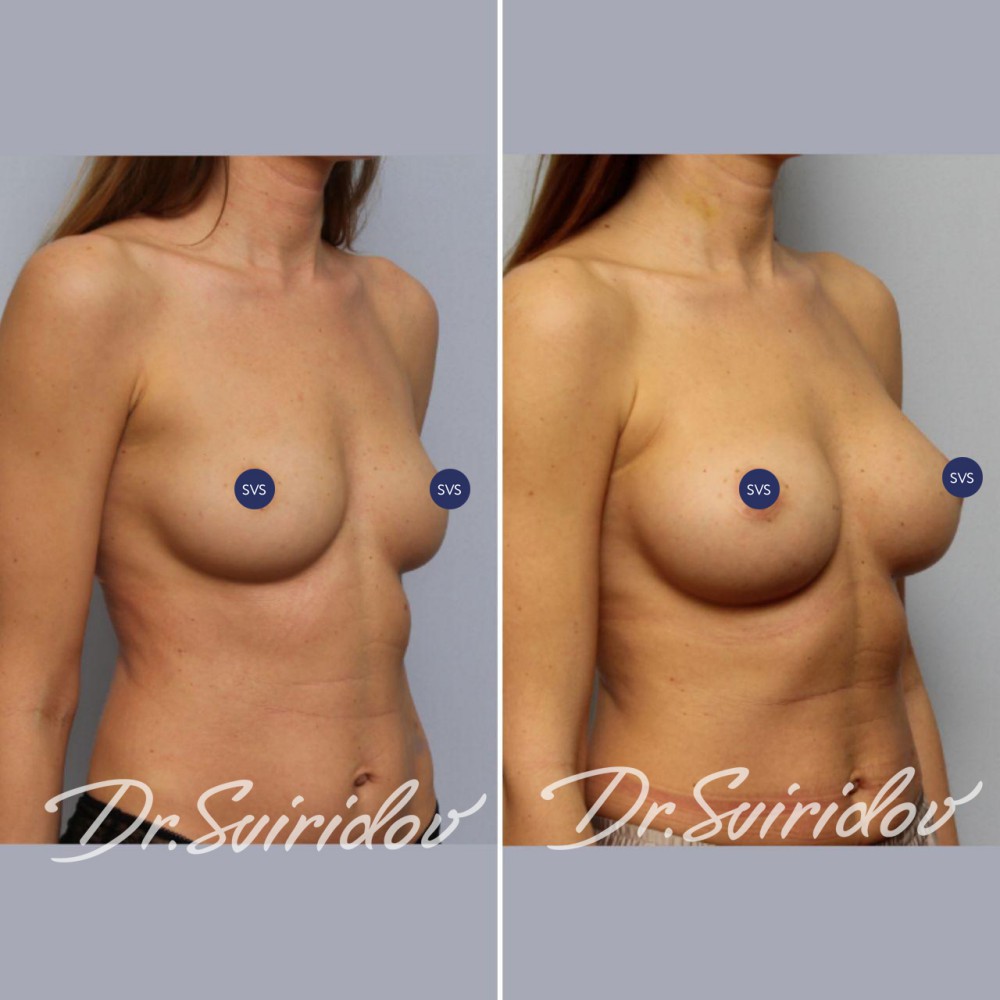 Выполнено увеличение груди по методике «Грудь без шва». Установлены имплантаты анатомической формы объёмом 280 мл.