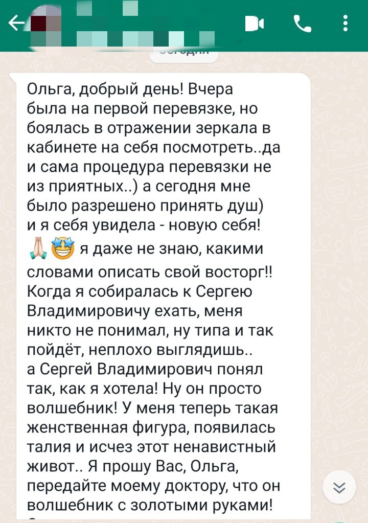 Даже не знаю, какими словами описать свой восторг!! Когда я собиралась к Сергею Владимировичу ехать, меня никто не понимал, ну типа и так пойдёт, неплохо выглядишь... а Сергей Владимирович понял так, как я хотела! Ну он просто волшебник! У меня теперь такая женственная фигура, появилась талия и исчез этот ненавистный живот. Мой доктор - волшебник с золотыми руками!"