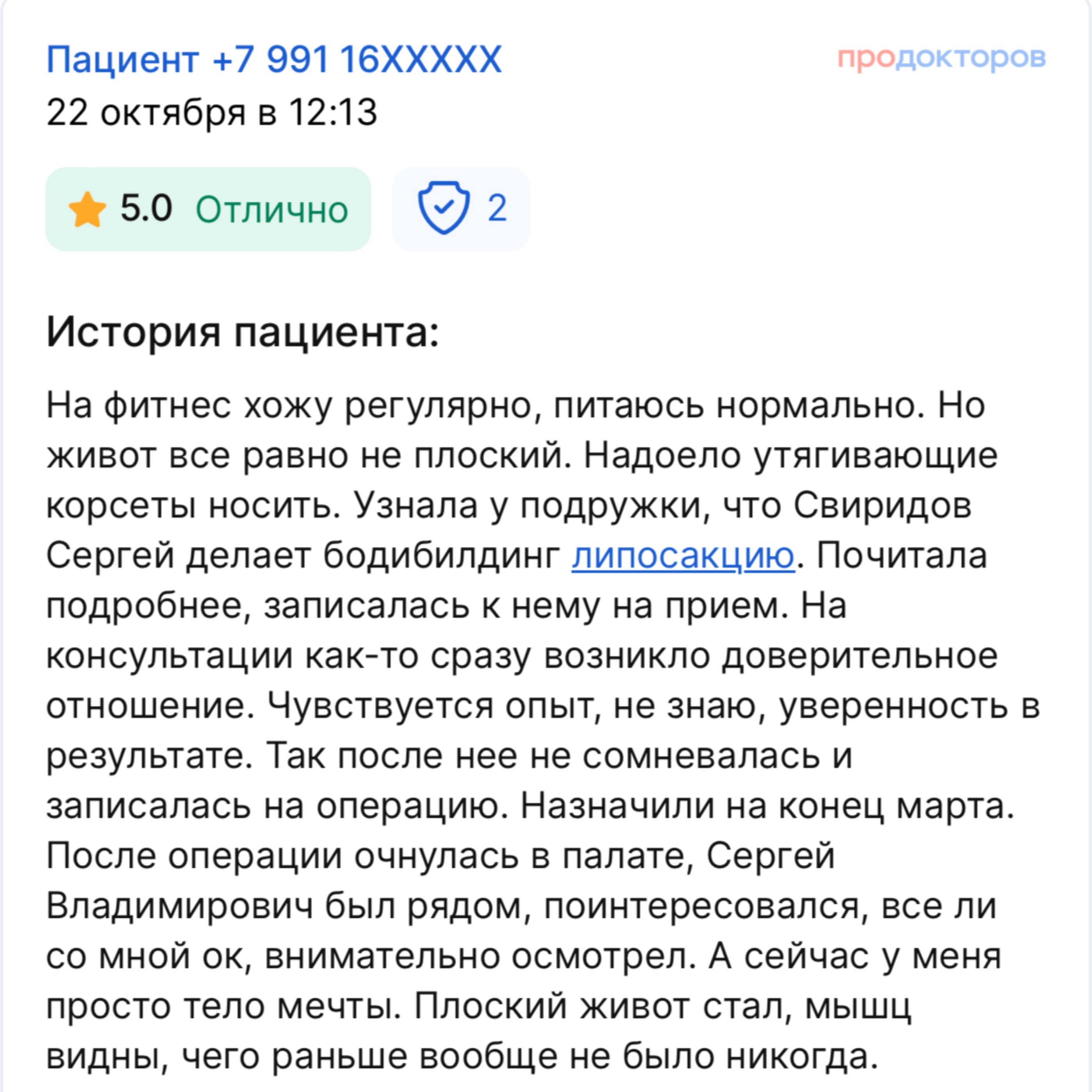 «На фитнес хожу регулярно, питаюсь нормально. Но живот все равно не плоский. Надоело утягивающие корсеты носить. Узнала у подружки, что Свиридов Сергей делает бодибилдинг липосакцию . Почитала подробнее, записалась к нему на прием. На консультации как-то сразу возникло доверительное отношение. Чувствуется опыт, не знаю, уверенность в результате. Так после нее не сомневалась и записалась на операцию. Назначили на конец марта. После операции очнулась в палате, Сергей Владимирович был рядом, поинтересовался, все ли со мной ок, внимательно осмотрел. А сейчас у меня просто тело мечты. Плоский живот стал, мышц видны, чего раньше вообще не было никогда.»