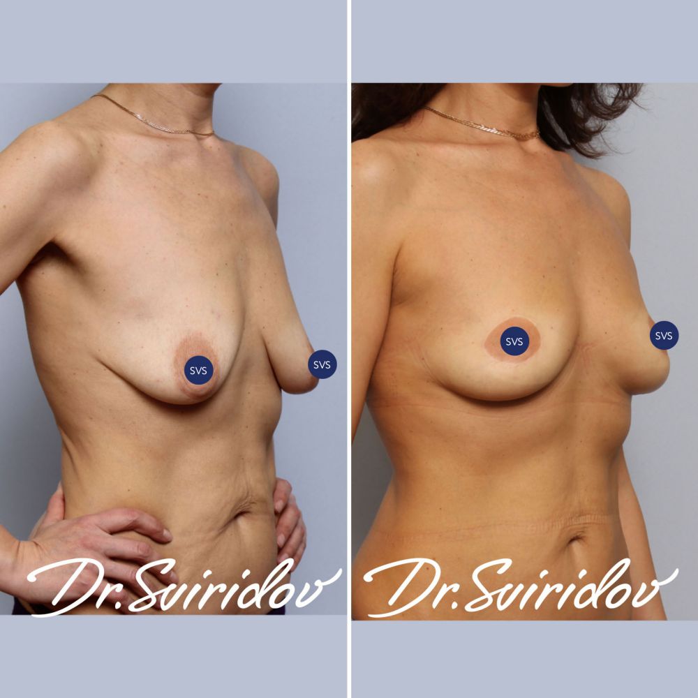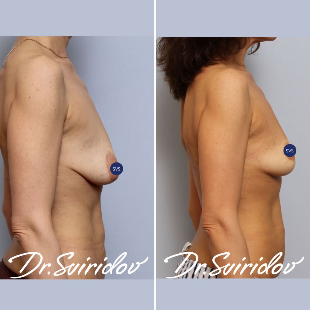 Циркулярная подтяжка имеет меньше возможностей, чем т-образная подтяжка, но, тем не менее, посмотрите, что сосково-ареолярный комплекс расположен выше, размер ареолы уменьшился, нижний склон груди сократился. Грудь в целом стала более подтянутой, а разрез только по ареоле.