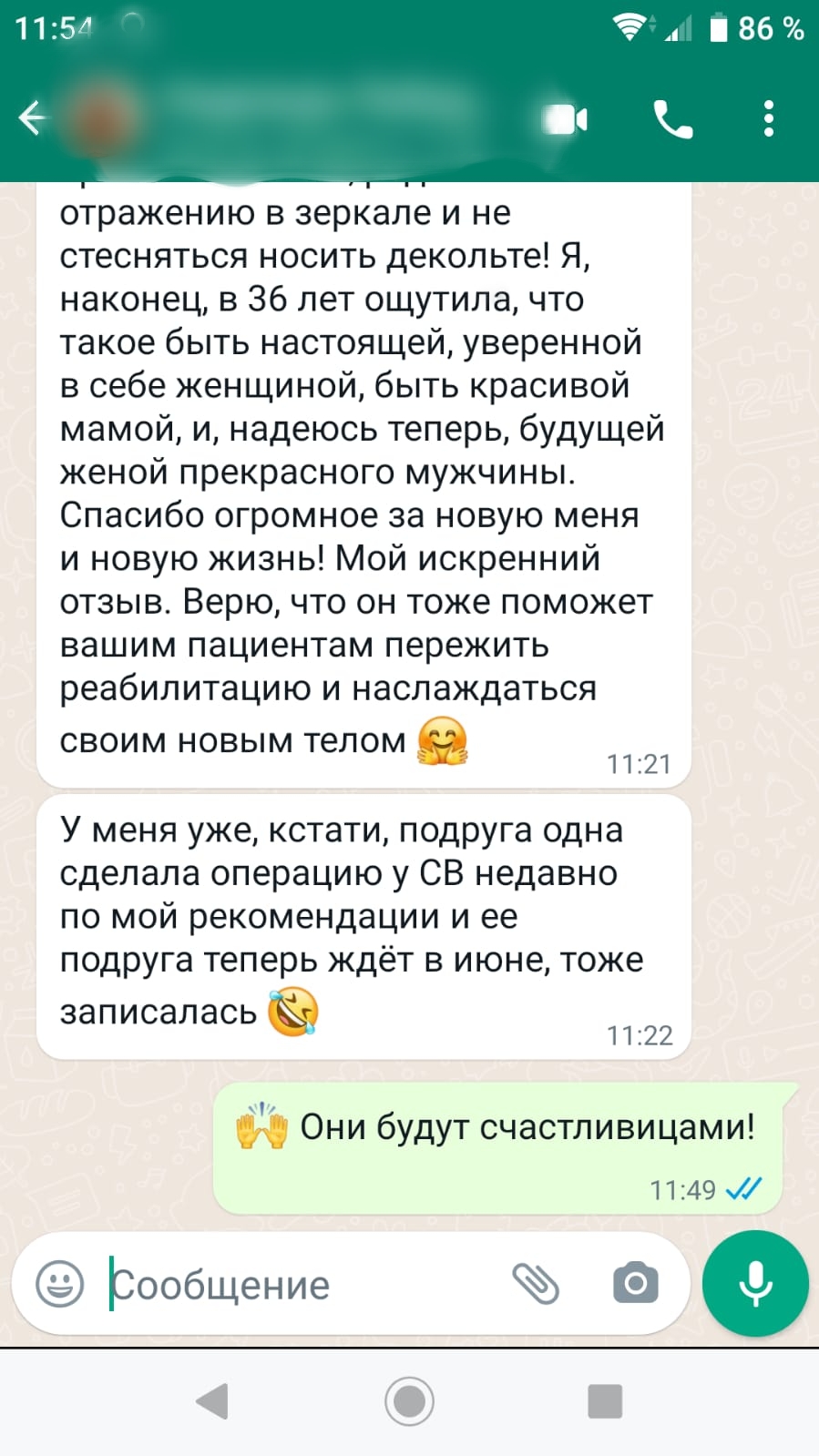 Я, наконец, в 36 лет ощутила, что такое быть настоящей, уверенной в себе женщиной, быть красивой мамой, и, надеюсь теперь, будущей женой прекрасного мужчины. Спасибо огромное за новую меня и новую жизнь! Мой искренний отзыв. Верю, что он тоже поможет вашим пациентам пережить реабилитацию и наслаждаться своим новым телом!"