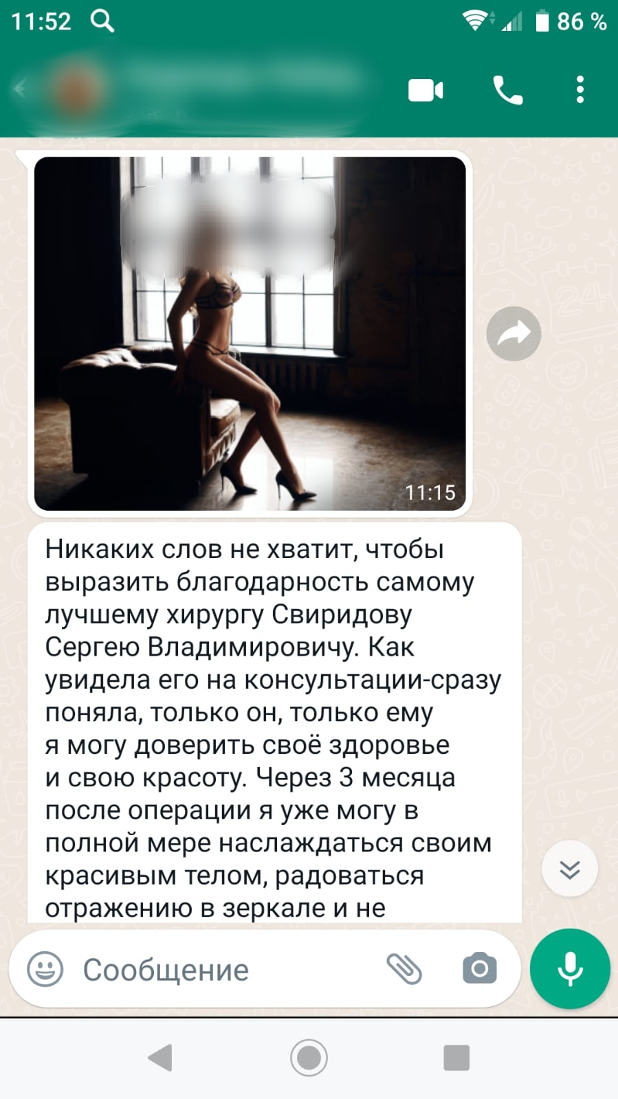 ...благодарность самому лучшему хирургу Свиридову Сергею Владимировичу. Как увидела его на консультации - сразу поняла только он. Только ему я могу доверить своё здоровье и свою красоту. Через 3 месяца после операции я уже могу в полной мере наслаждаться своим красивым телом, радоваться отражению в зеркале и не стесняться носить декольте!