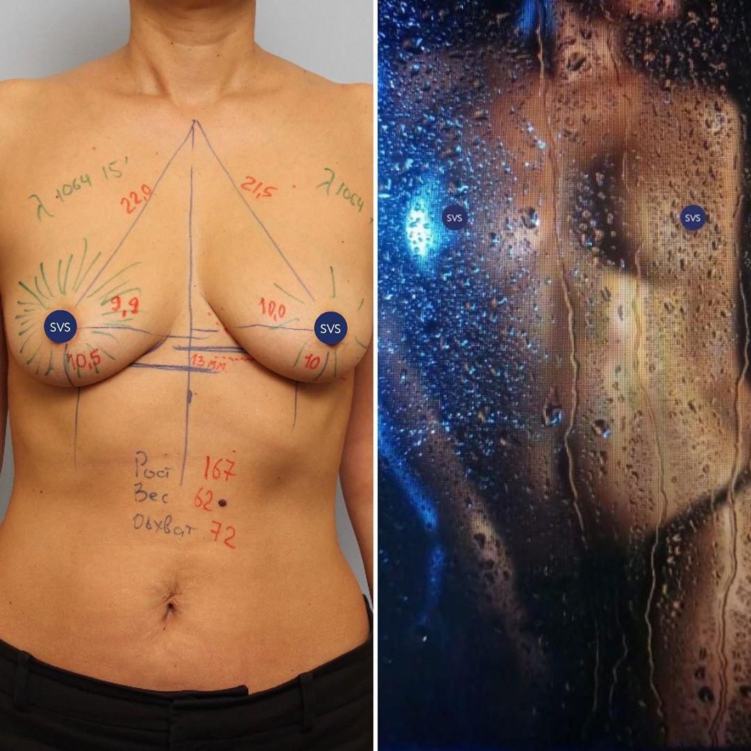 Моя пациентка увеличила грудь по методике «Грудь без шва». Суть метода в строгом следовании принципам пластической операции по увеличению груди и максимально щадящей технике самого вмешательства.