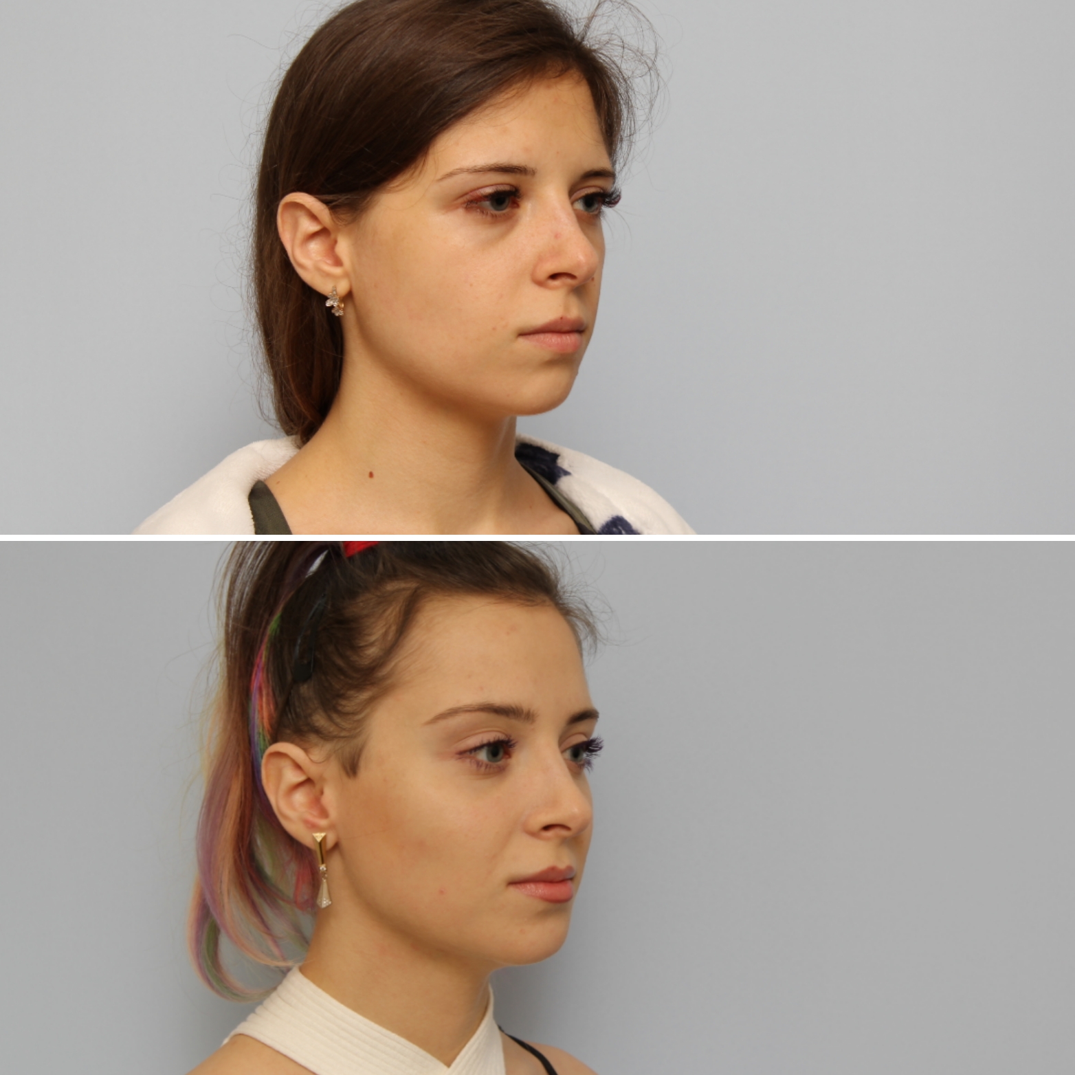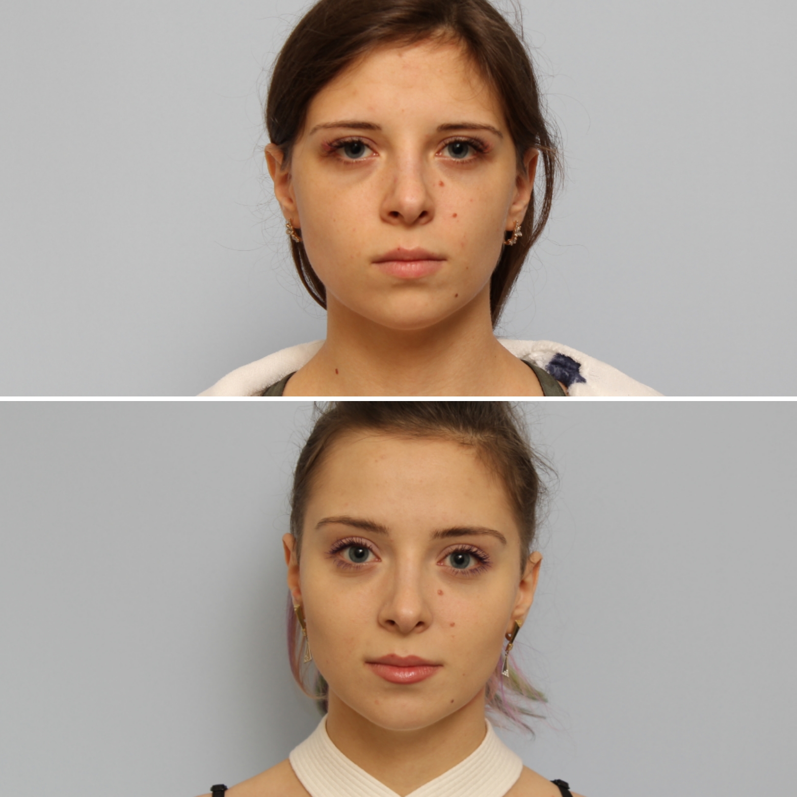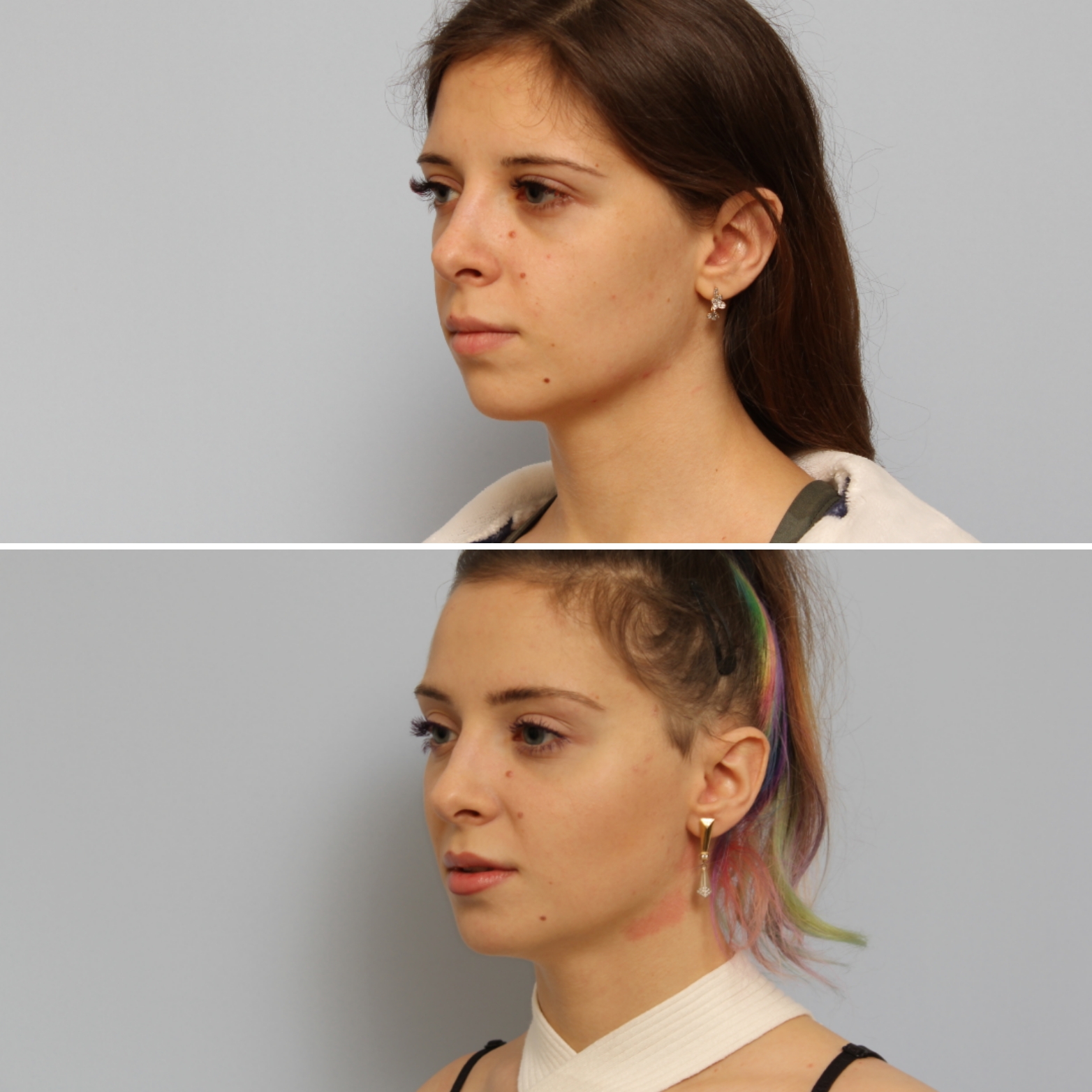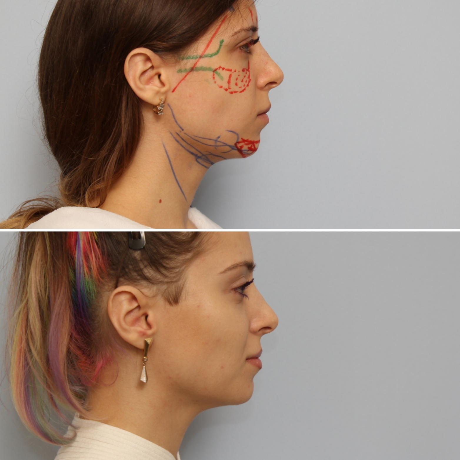 - Пациентке выполнены: эндоскопическая подтяжка лица, липосакция подбородка, липофилинг подбородка и липофилинг скул.