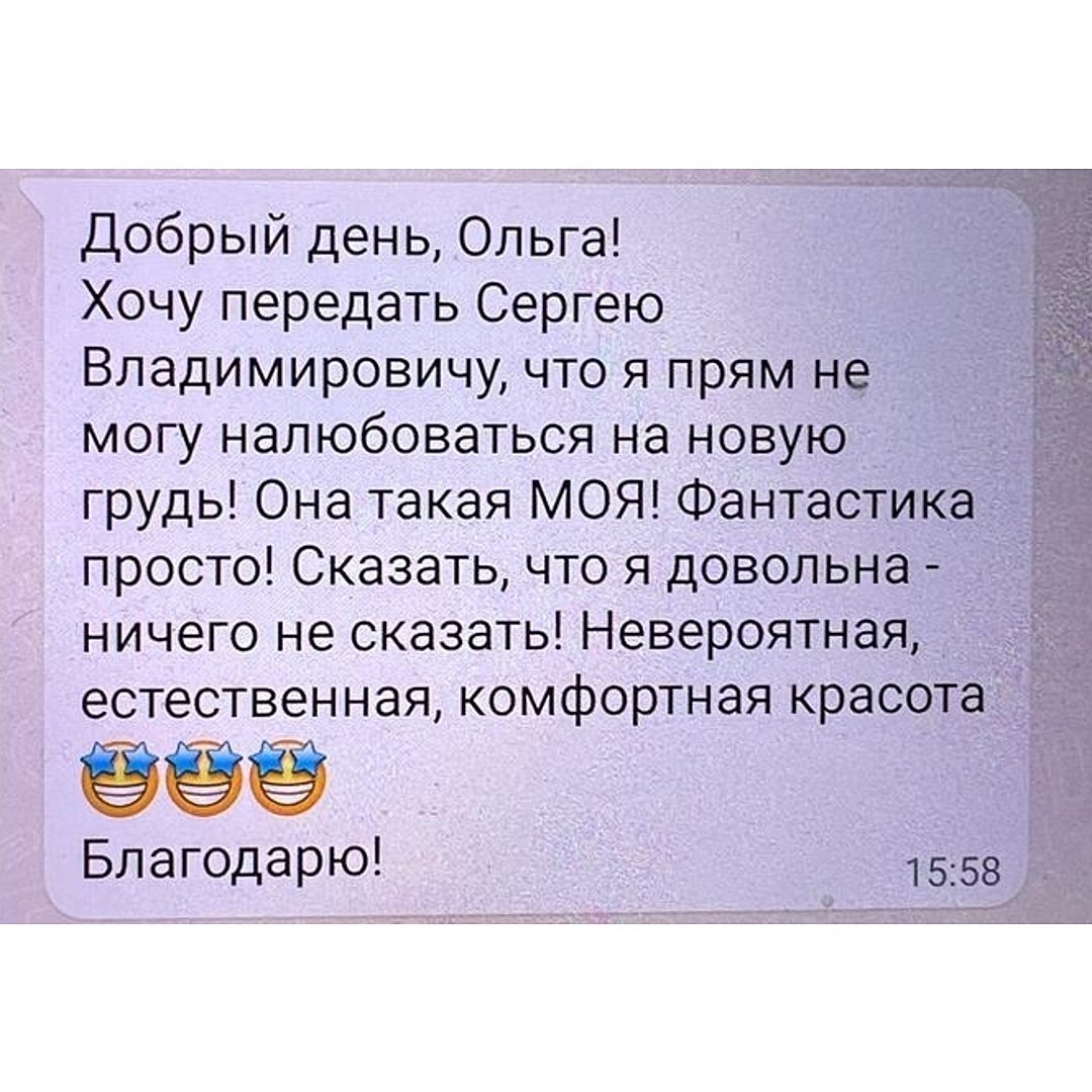 "Хочу передать Сергею Владимировичу, что я прям не могу налюбоваться на новую грудь! Она такая МОЯ! Фантастика просто! Сказать, что я довольна ничего не сказать! Невероятная, естественная, комфортная красота. Благодарю!"