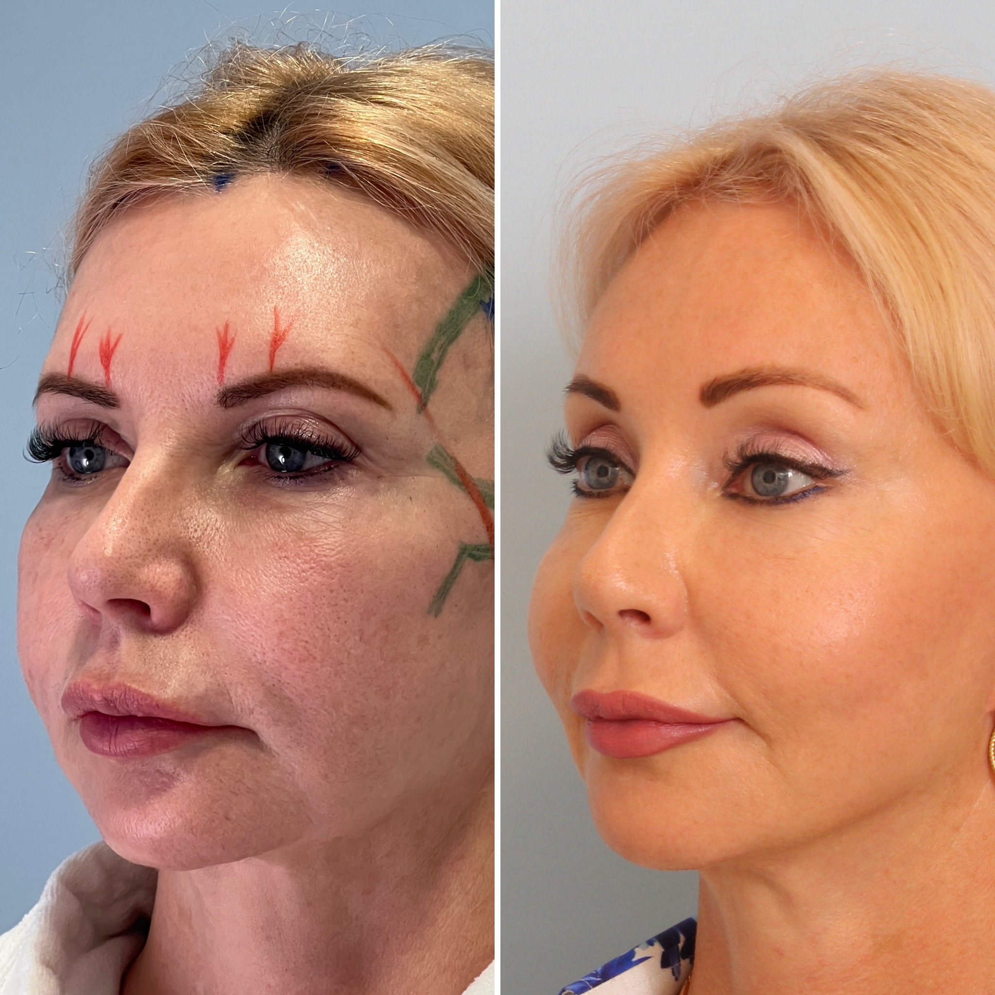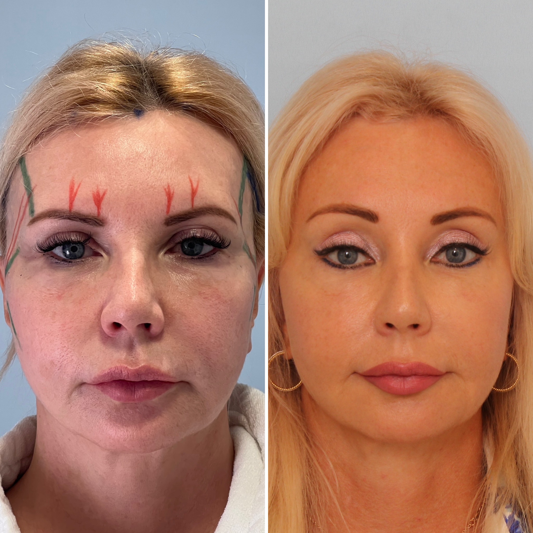 Мы избавили девушку от поперечных морщин на лбу, вертикальных складок над переносицей, опустившихся наружных уголков глаз, опущения верхних век и уставшего взгляда.