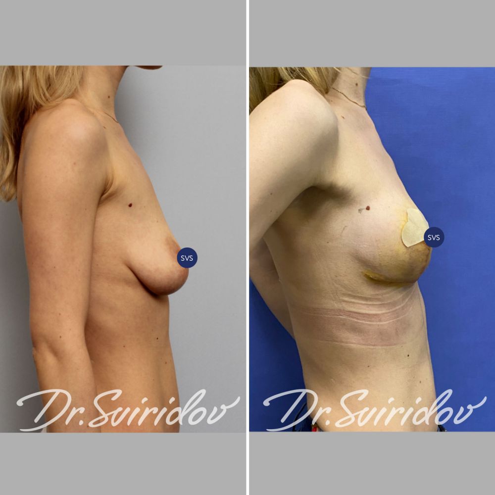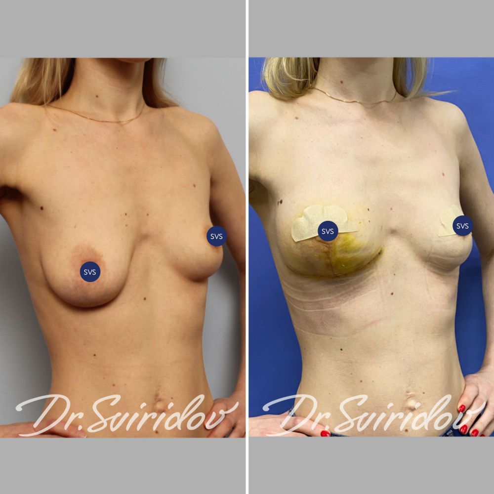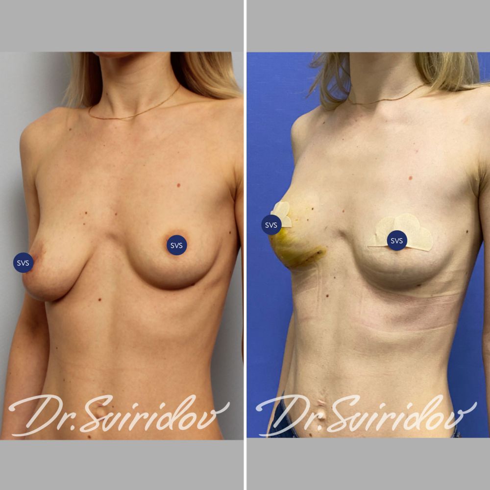 Исходно у пациентки правая грудь была опущена. После операции мы восстановили асимметрию, сосково ареолярный комплекс на одном уровне.