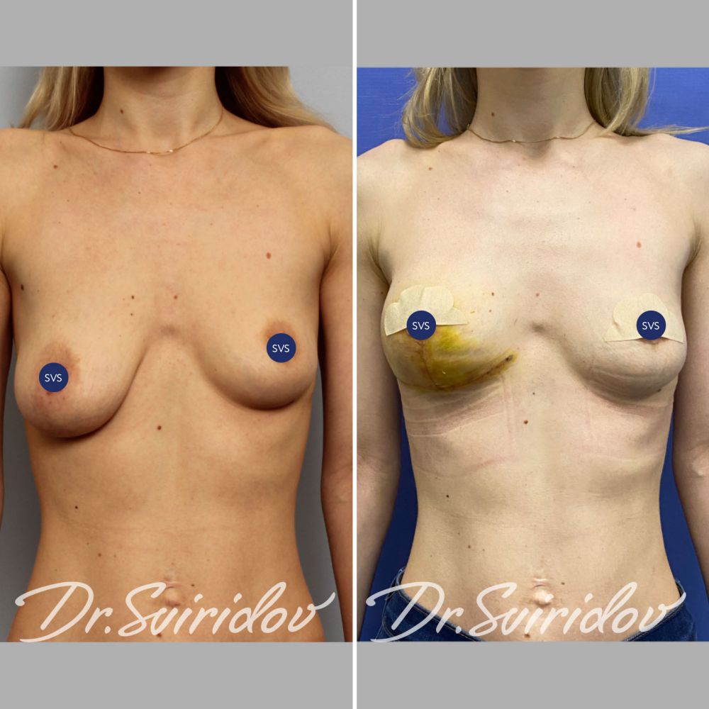 На этом сроке правая молочная железа немного большего объема — это послеоперационный отек, но несмотря на это швы выглядят эстетично и аккуратно. Когда пройдет отек — можно будет сравнивать объем груди.