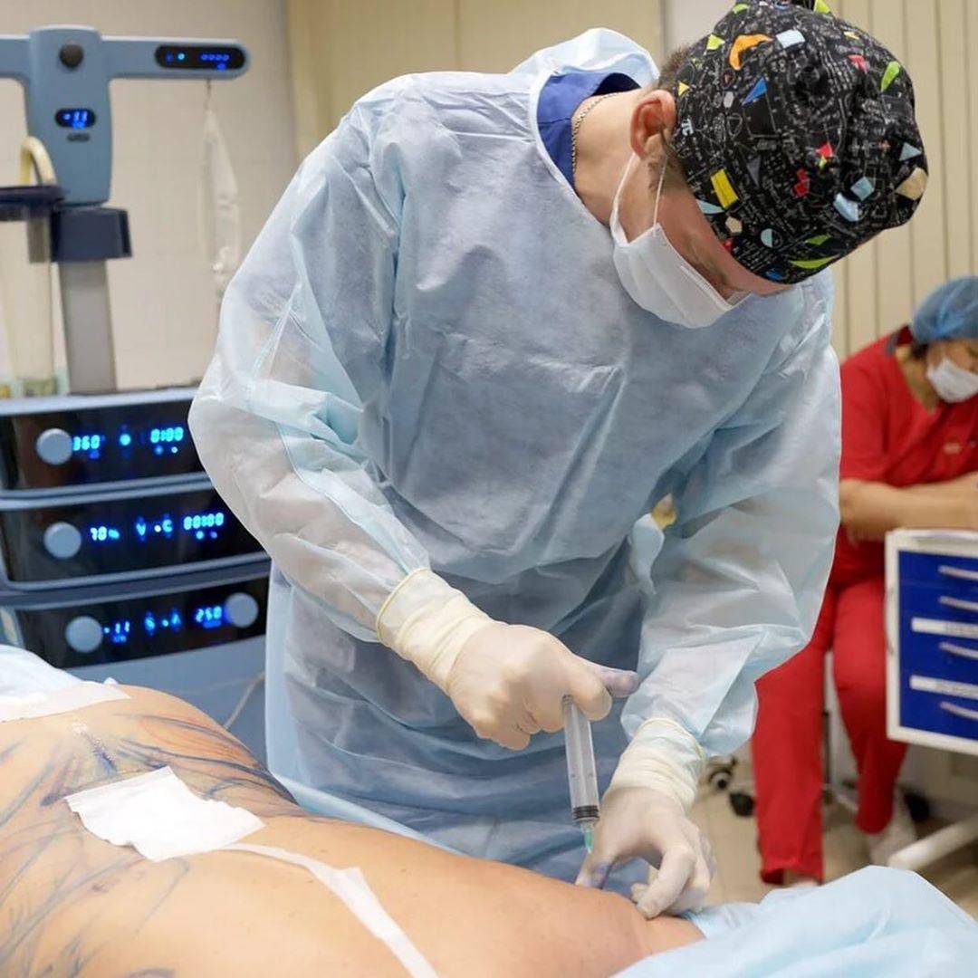 Выполнена липосакция внутренней поверхности бедер, удалены жировые ловушки.