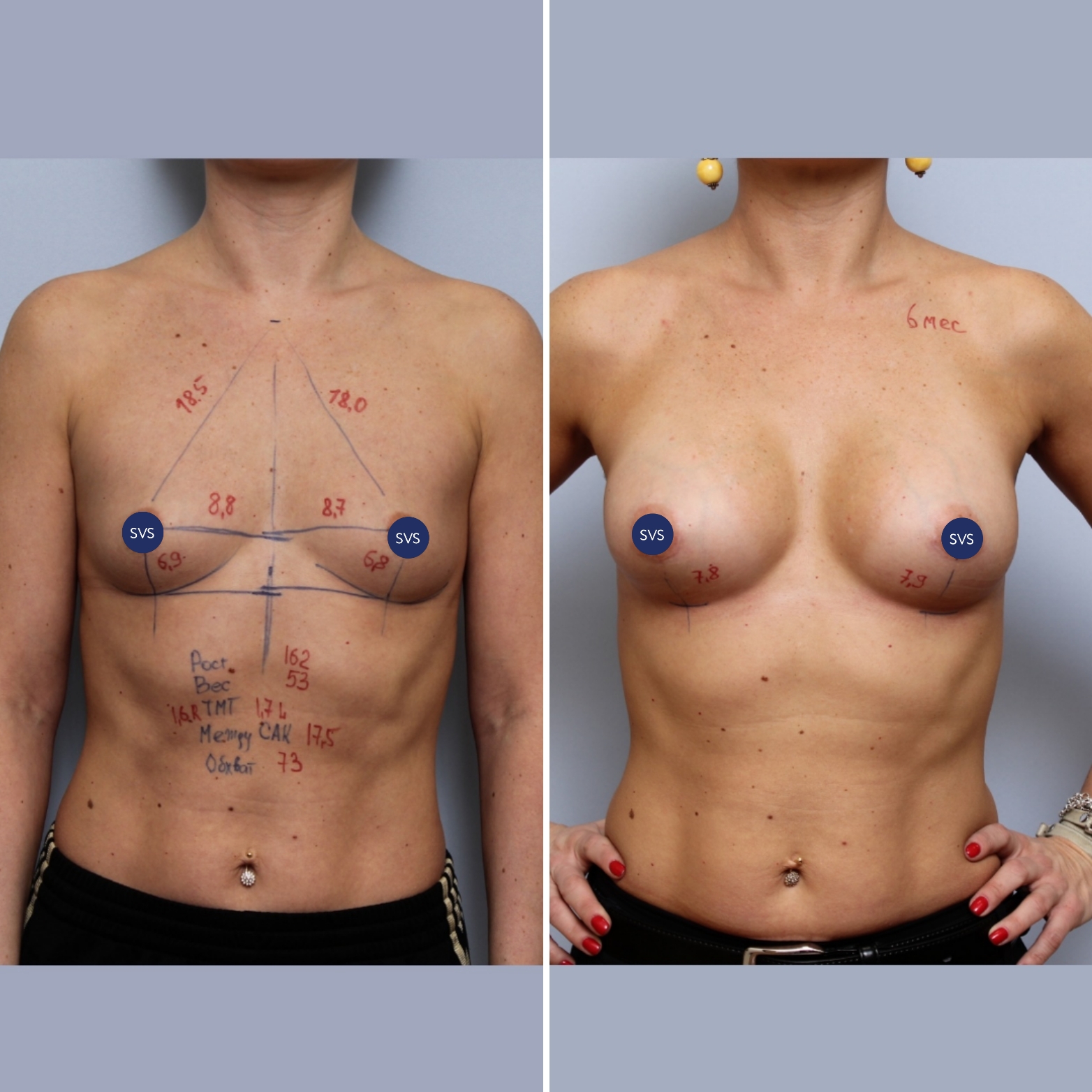 Сравнительный анализ пациентки после увеличения груди по методике "Грудь без шва" - патент №2521346.