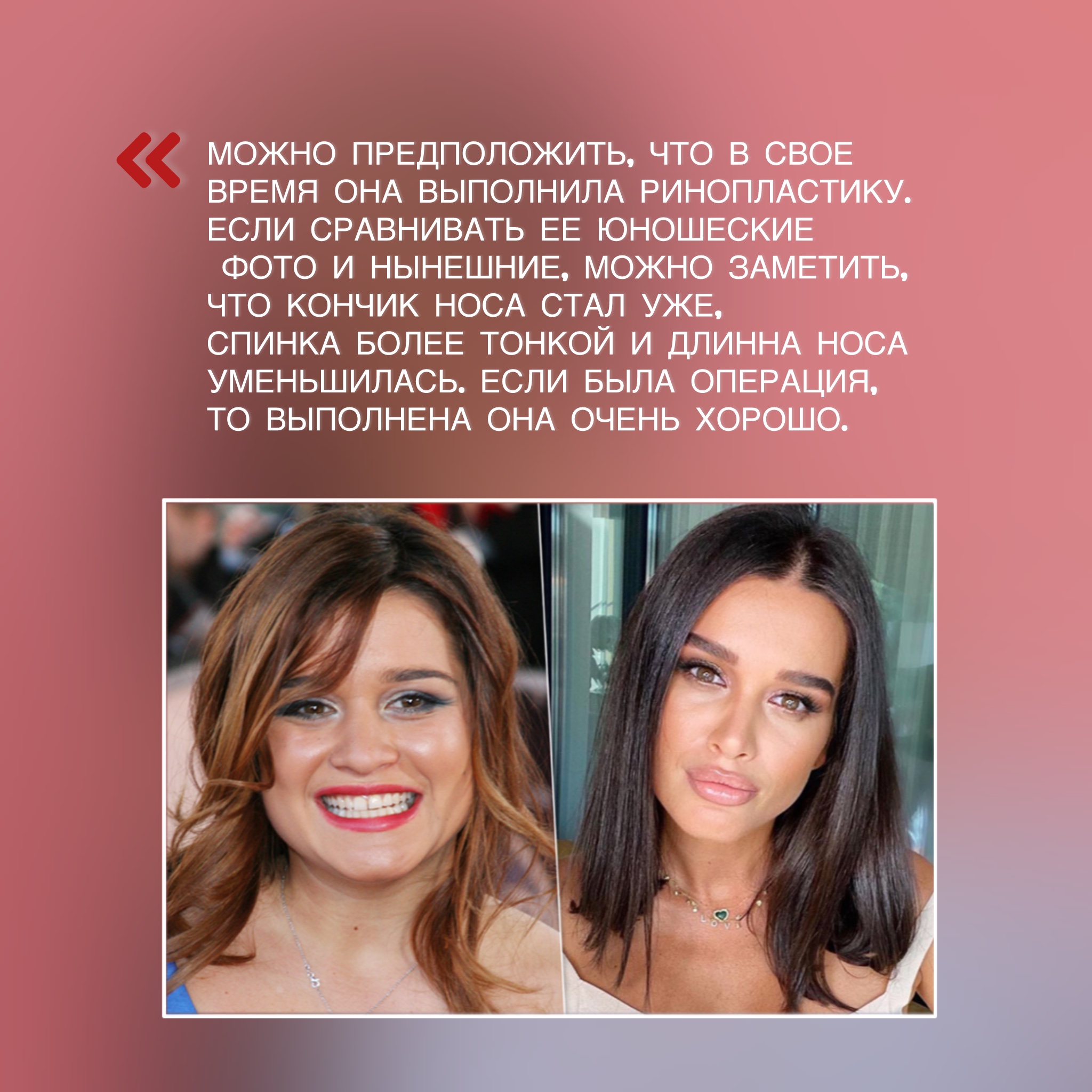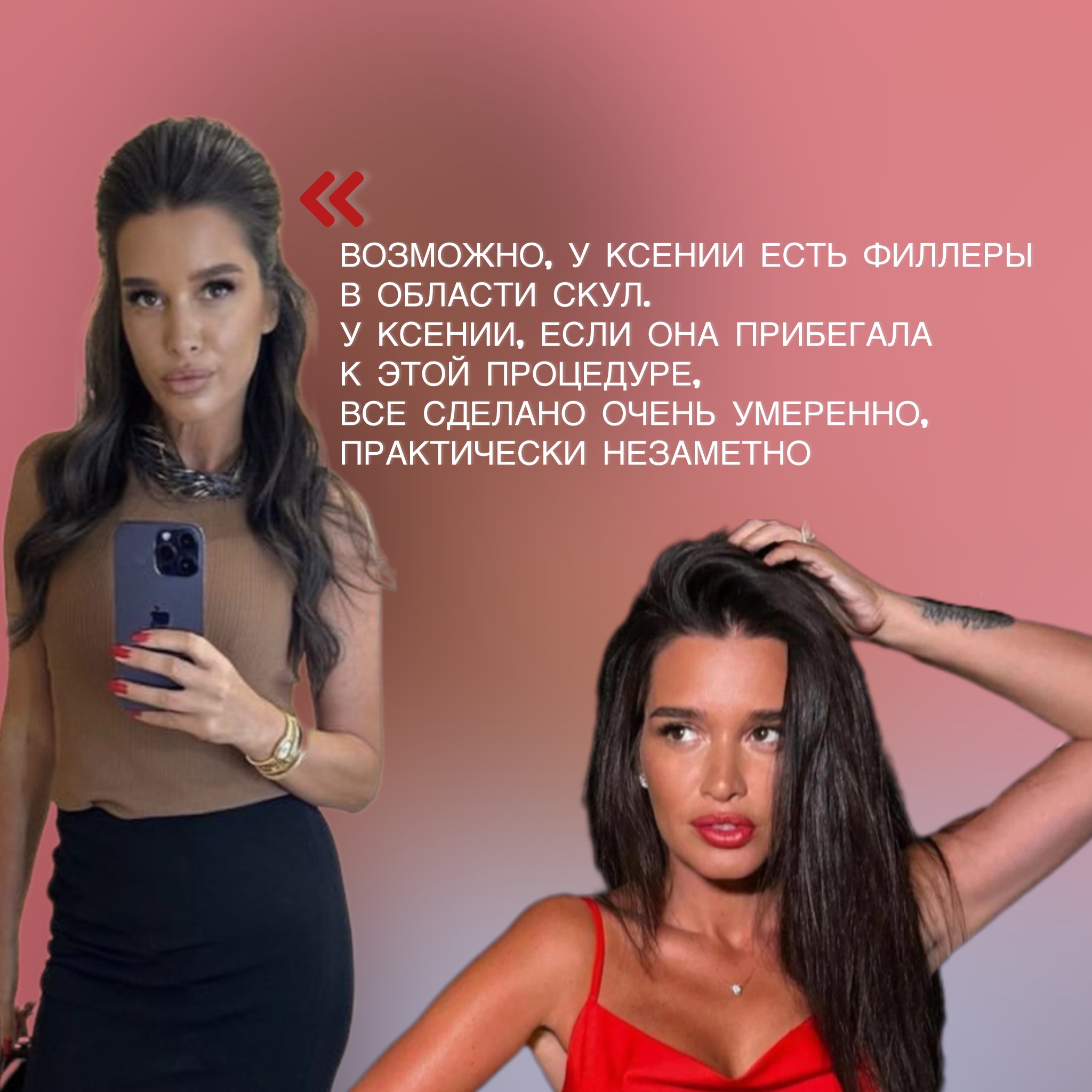 Можно предположить, что в свое время она выполнила ринопластику. Если сравнивать ее юношеские фото и нынешние, можно заметить, что кончик носа стал уже, спинка более тонкой и длина носа уменьшилась. Если была операция, то выполнена она хорошо. Также Бородина могла выполнить безоперационный сфокусированный ультразвуковой SMAS лифтинг, который вытягивает лица. Возможно, у Ксении есть филлеры в области скул. Если она прибегала к этой процедуре, все сделано очень умеренно, практически незаметно. О том, сколько предположительно Ксения потратила на процедуру, читайте в моей статье