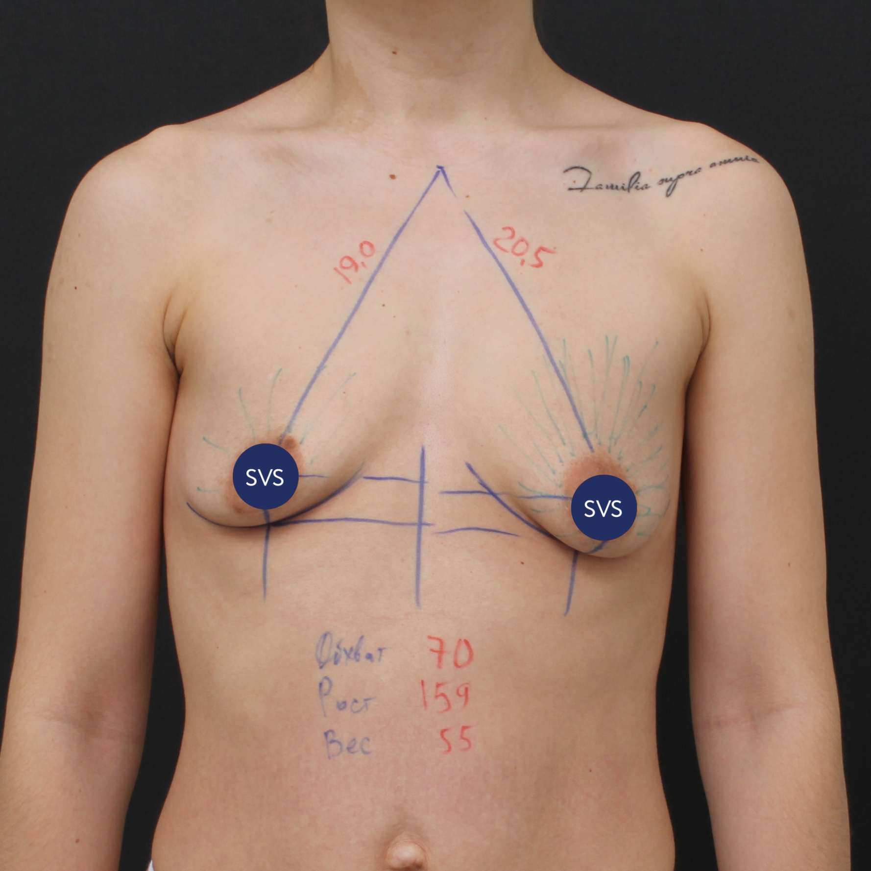 Из-за наличия выраженной асимметрии по положению сосково-ареолярного комплекса, то есть левый ареолярный комплекс значительно ниже, чем правый (на 1,5 см), само пятно груди также расположено на грудной клетке ниже, чем с правой стороны и нижний склон груди слева длиннее, чем справа.