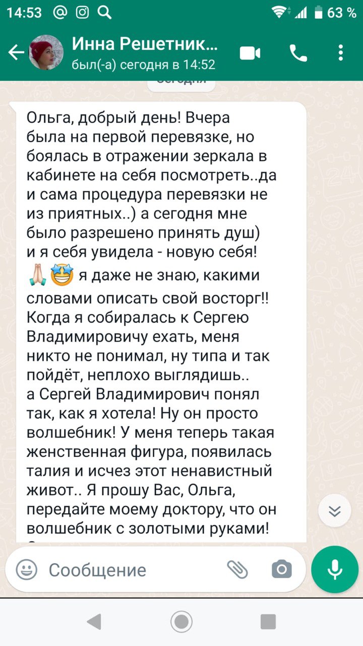 Даже не знаю, какими словами описать свой восторг!! Когда я собиралась к Сергею Владимировичу ехать, меня никто не понимал, ну типа и так пойдёт, неплохо выглядишь... а Сергей Владимирович понял так, как я хотела! Ну он просто волшебник! У меня теперь такая женственная фигура, появилась талия и исчез этот ненавистный живот. Мой доктор - волшебник с золотыми руками!"