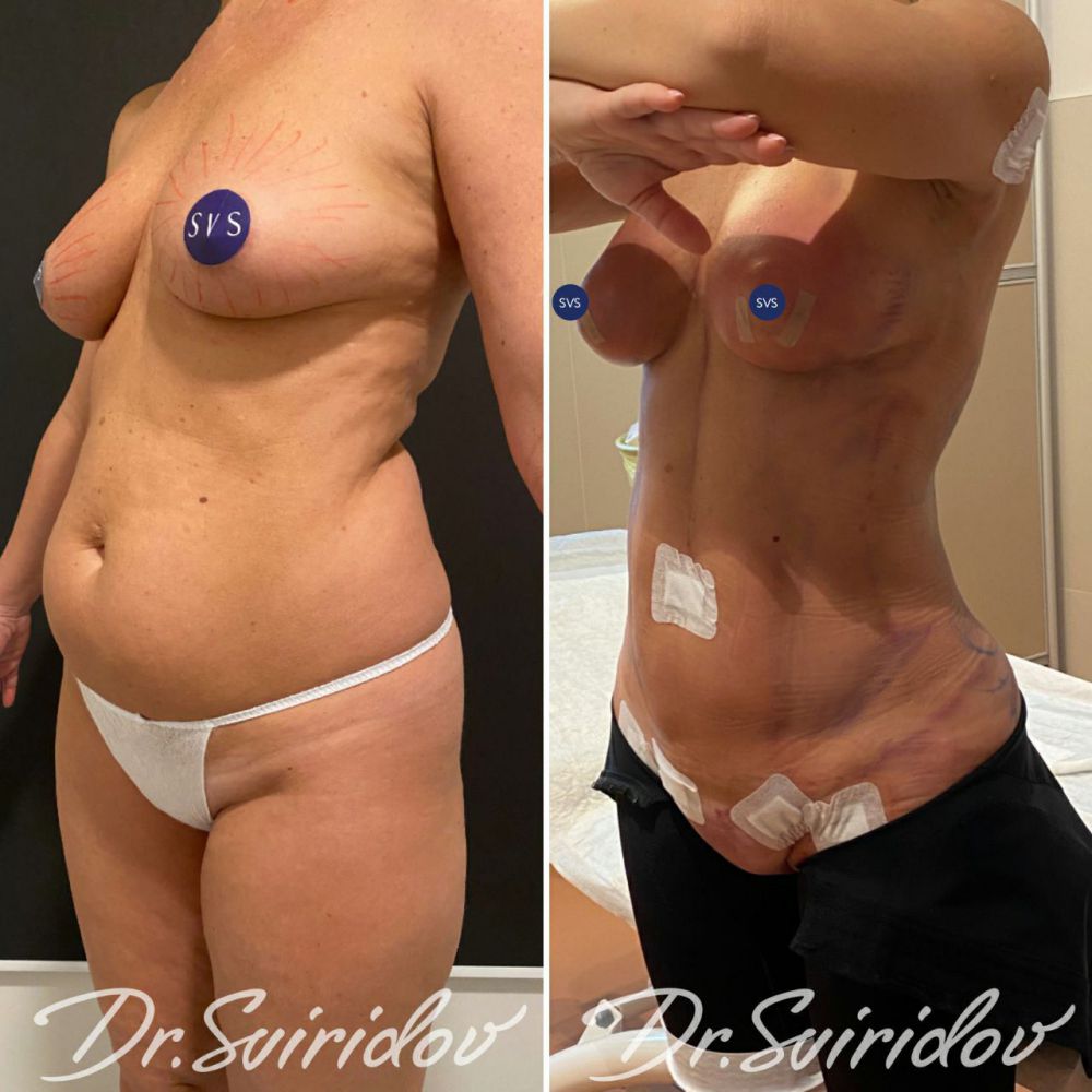 - Пациентке выполнено липоскульптурирование живота, спины, липофилинг груди и ягодиц.