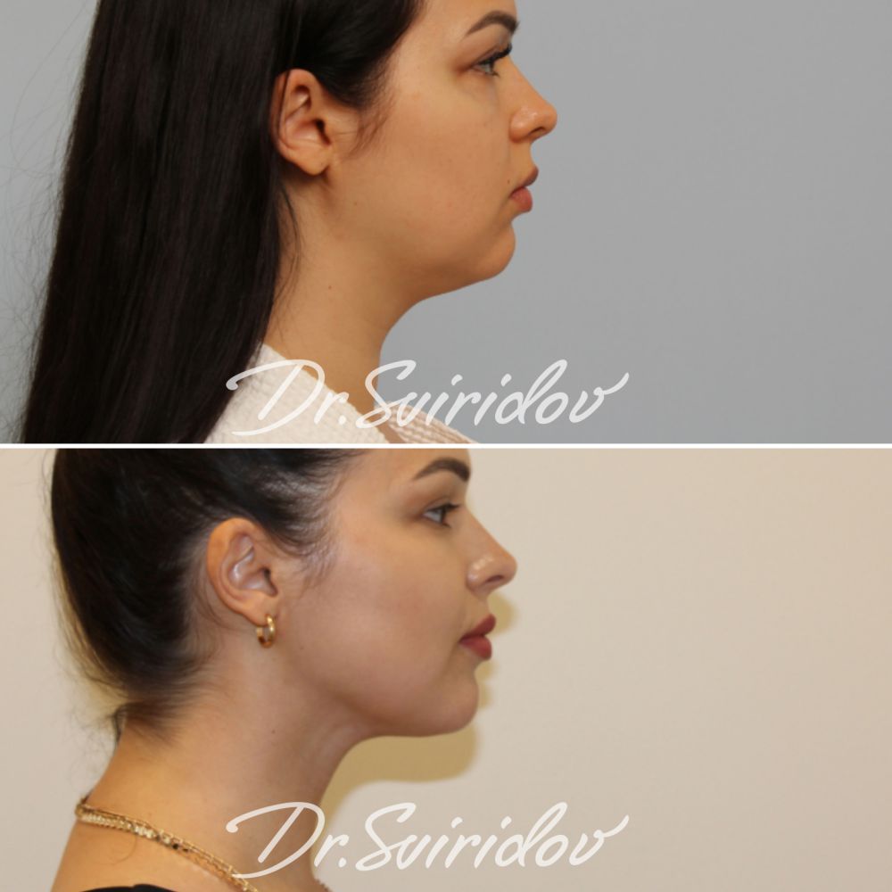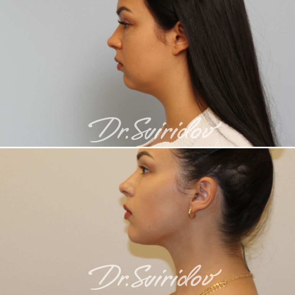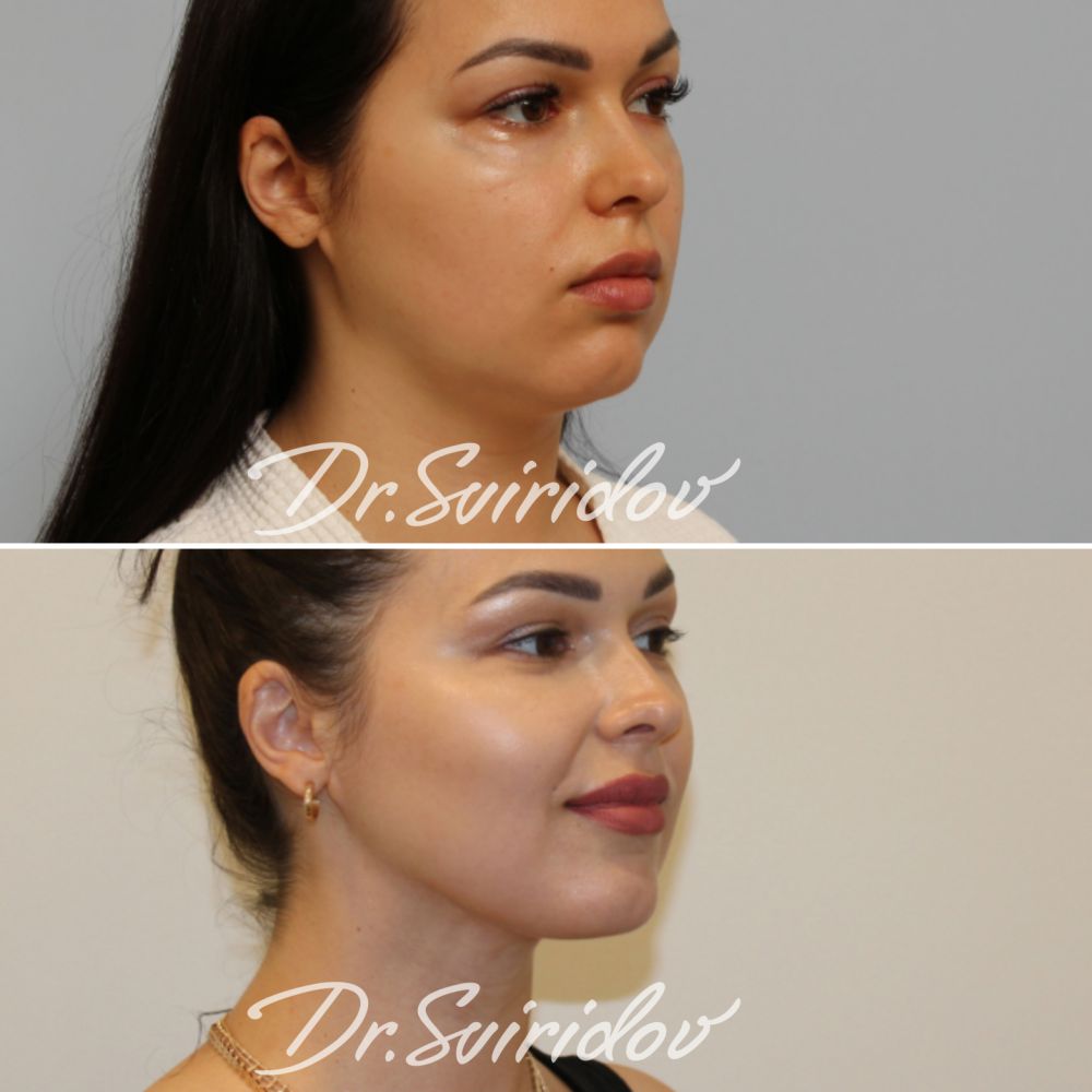 В ходе операции мы выделили шейно-подбородочный угол, благодаря этому лицо стало стройным и вытянутым. Напомню, жир мы использовали для увеличения проекции подбородка и скул.