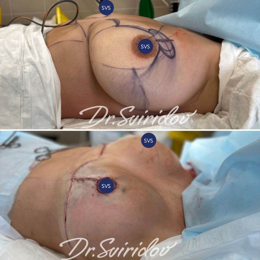 Для уменьшения груди выполняются разрезы вокруг соска и один перевернутый Т-образный разрез между соском и складкой под грудью. После операции на разрезы накладываются скрытые швы, которые постепенно растворяются организмом.
