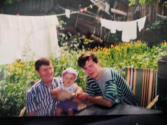 Листайте/ Это мой сын. Вот этот молодой человек в штанах — это я, молодой папа... А этот мальчуган тоже, как положено, в штанах и шерстяных носках. Спасибо бабушкам за такие теплые вещи.
