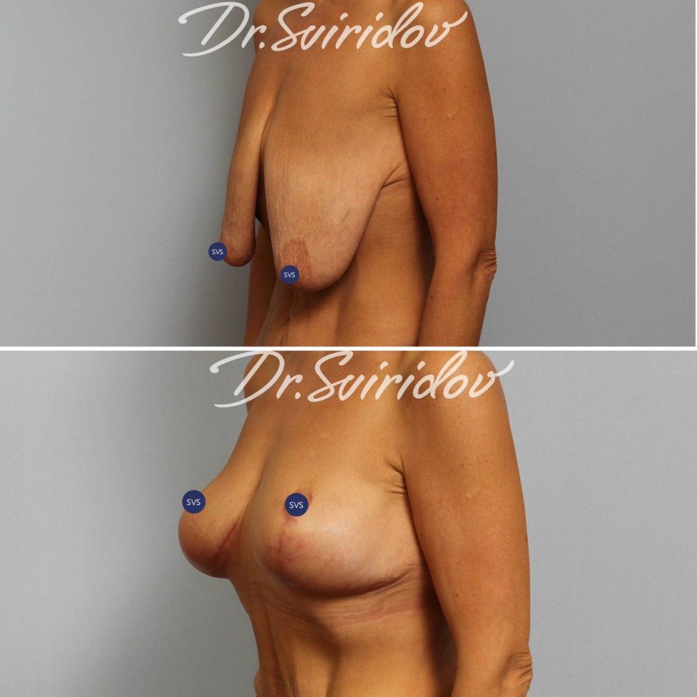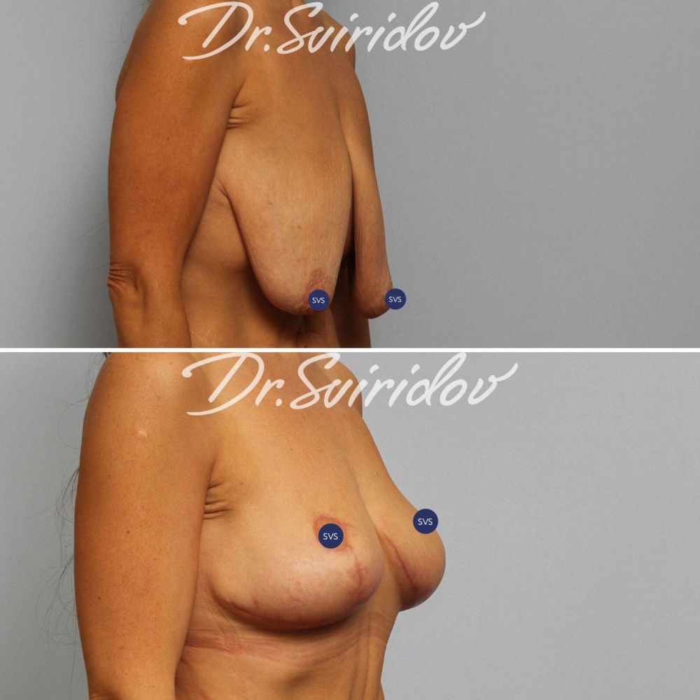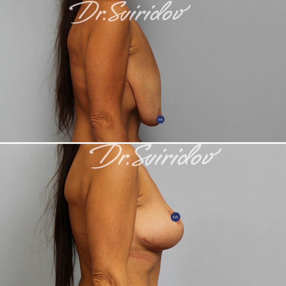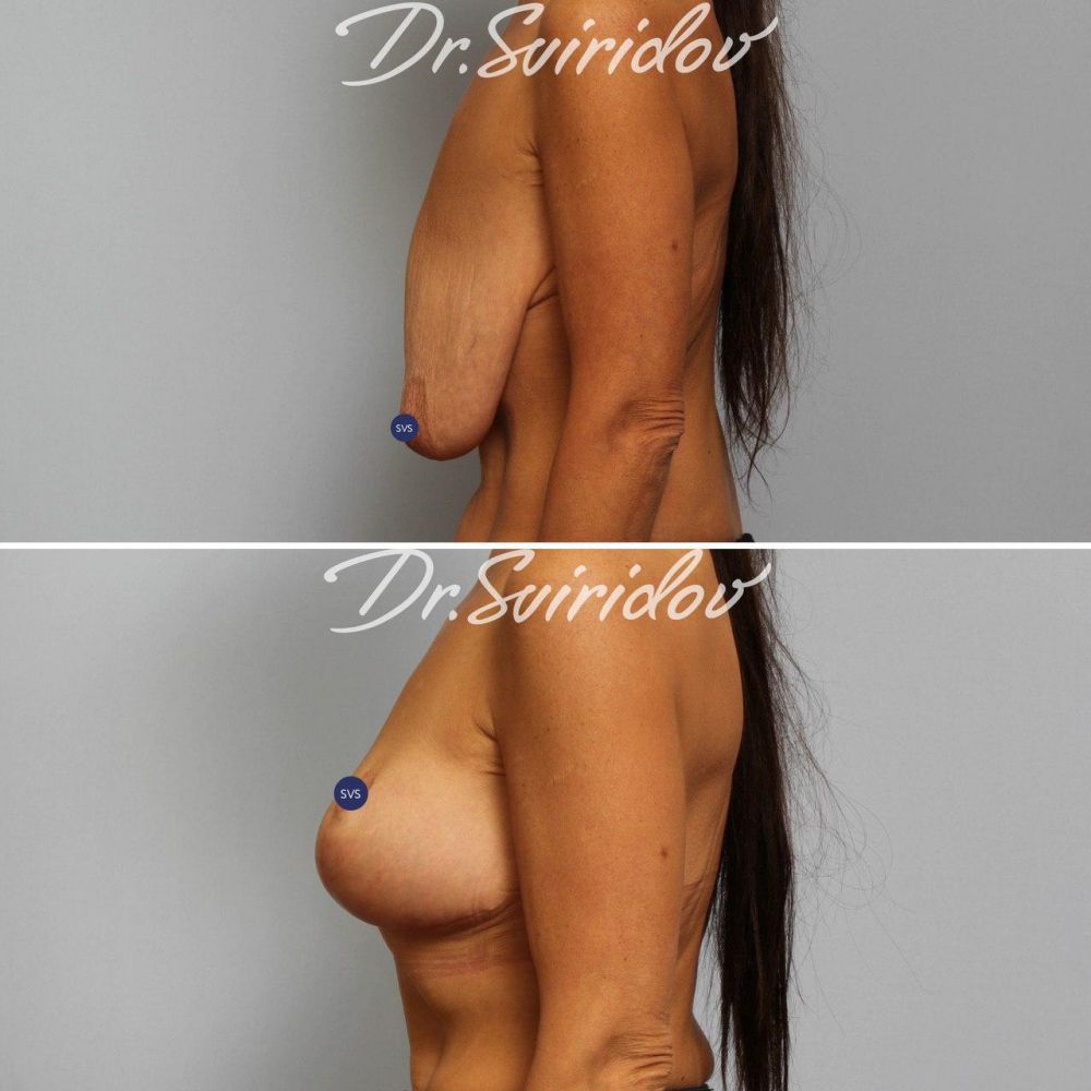 Этот пример Вам наглядно показывает, что объем груди при Т-образной подтяжке не уменьшается, как многие думают, а как минимум сохраняется полностью с визуальным эффектом даже некоторого ее увеличения.