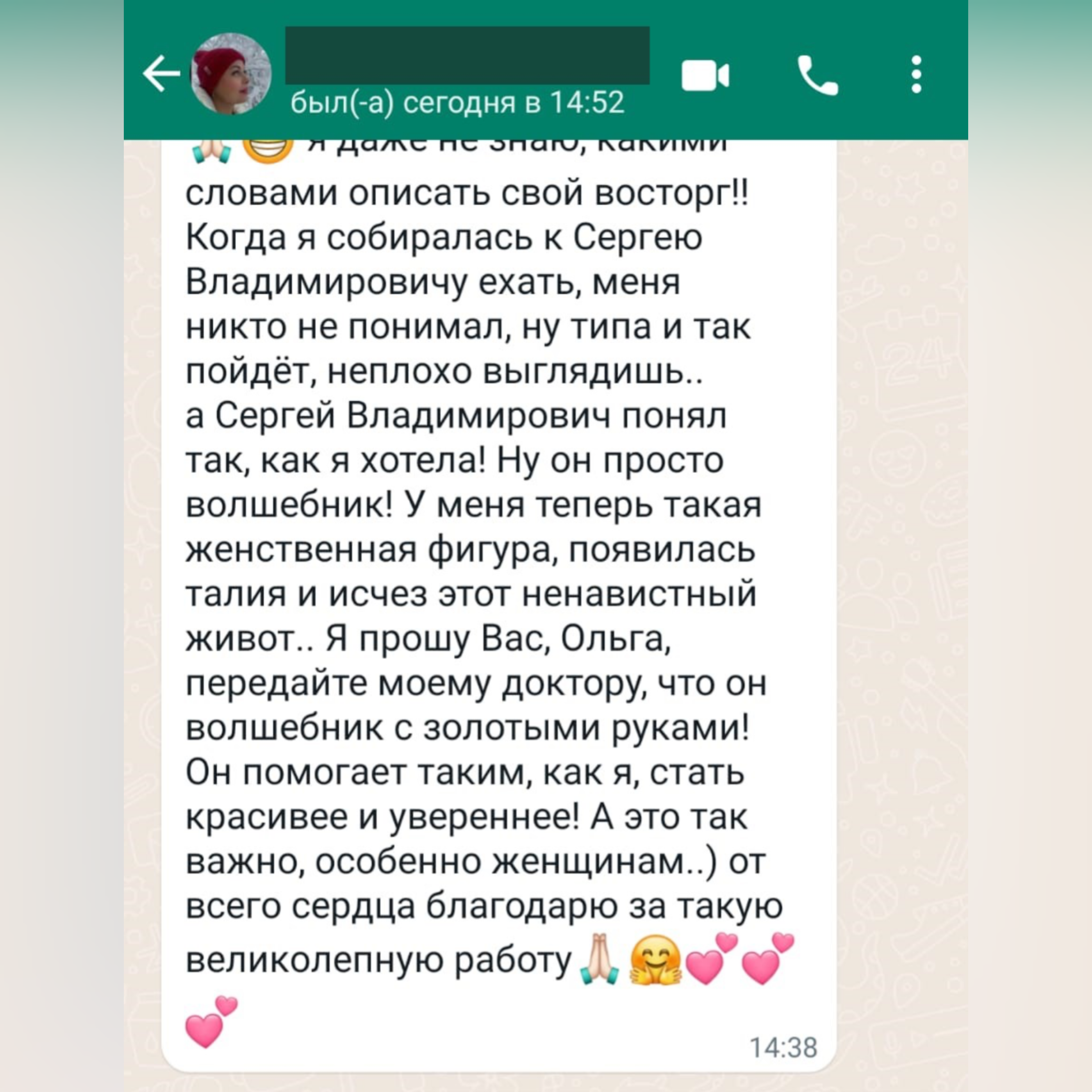 Когда я собиралась к Сергею Владимировичу ехать, меня никто не понимал, ну типа и так пойдёт, неплохо выглядишь.. а Сергей Владимирович понял так, как я хотела! Ну он просто волшебник! У меня теперь такая женственная фигура, появилась талия и исчез этот ненавистный живот.. Я прошу Вас, Ольга, передайте моему доктору, что он волшебник с золотыми руками!